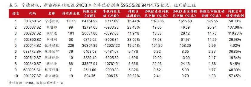 从加仓情况来看,宁德时代、新宙邦和欣旺达24Q3加仓市值分别为595.55/26.94/14.75亿元,位列前三位,科达利和亿纬锂能位列4、5位。持仓市值增长前十中,受益于锂电主链景气度提升,业绩稳定的龙头公司加仓市值增量明显。