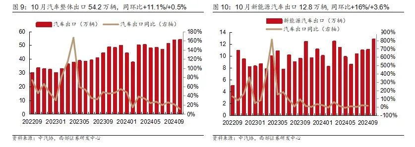 受欧洲关税影响,新能源车出口有所放缓。10月新能源汽车出口12.8万辆, 同环比+16%/+3.6%,其中,纯电汽车出口10.4万辆,插混汽车出口2.4万辆;10月汽车整体出口54.2万辆,同环比+11.1%/+0.5%。1-10月新能源汽车累计出口105.8万辆,同比+6.3%,其中,纯电汽车累计出口83.6万辆,插混汽车累计出口22.2万辆。1-10月汽车整体累计出口485.5万辆,同比+23.8%。