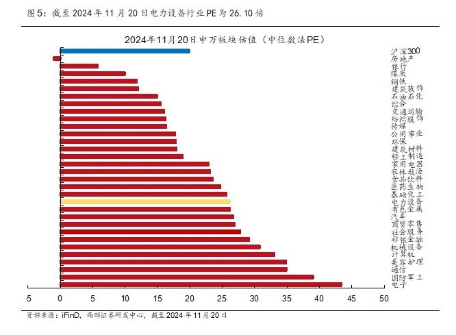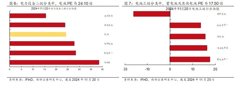 截至2024年11月20日电力设备行业PE(TTM 中位数法,下同)为26.10倍,相对沪深300估值溢价31.38%。在电力设备二级分类中,电池PE为24.10倍,处于电力设备二级分类适中位置。电池三级分类中,蓄电池及其他电池PE为17.50倍,在电池分类中估值最高,电池化学品其次,锂电池、锂电专用设备PE分别为15.45/13.38倍。