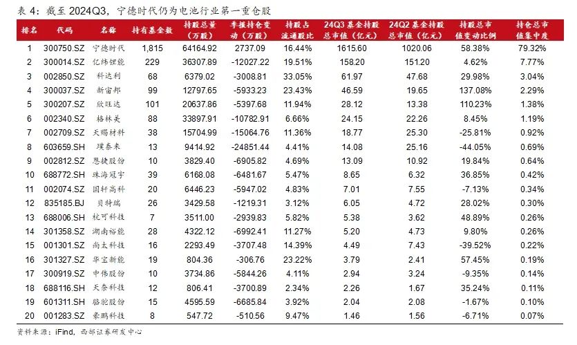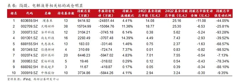 从减仓情况看,24Q3业绩表现一般、且行业供需未有明显改善的璞泰来、天赐材料、当升科技减仓变动金额较大。锂电板块24Q3整体减仓规模明显小于加仓金额,各环节标的出现一定程度分化。