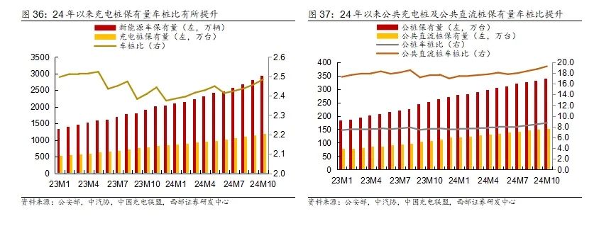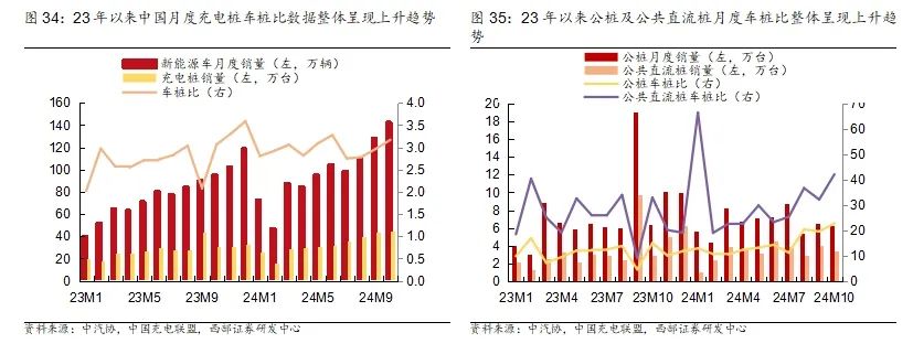 24年以来中国充电桩保有量车桩比有所提升,整体车桩比数据逐步提升至2.5左右。根据公安部、中汽协、中国充电联盟数据,24年以来新能源车保有量及充电桩保有量同步提升,车桩比整体逐步提升至2.5左右,截至24M10,中国新能源车保有量约为2953万辆,充电桩保有量1188万台,车桩比达2.5。24年以来公共充电桩及公共直流充电桩保有量车桩比数据有所提升,截至24M10,中国公共充电桩保有量达339万台,车桩比达8.7,中国公共直流充电桩保有量达154万台,车桩比达19.2。