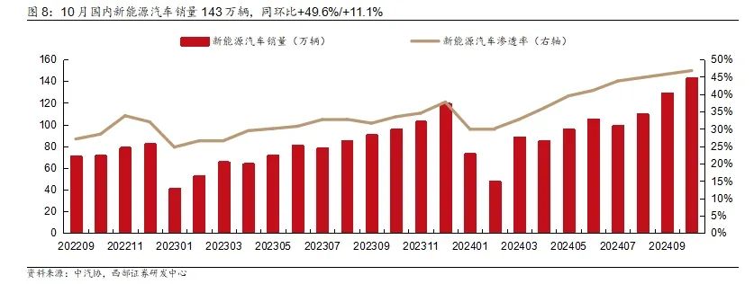 24年以旧换新成果显著,25年国内新能源车增速有望接近25%。11月21日,商务部在2024汽车金融产业峰会上表示,目前全国汽车报废更新申请量、全国汽车置换更新申请量均已突破200万份,累计超过400万份,日均补贴申请量持续保持在高位,受此带动1-10月全国报废汽车回收量同比增长超过50%,我们预计24年全年国内新能源汽车销量(不含出口,下同)有望达到1141万辆,同比+37.6%;目前,25年新一轮政策时间节点尚不确定,我们认为如果25年新补贴政策落地时间前置,有望进一步提振下游需求,预计25年国内新能源汽车销量有望达到1426万辆,同比+24.92%。