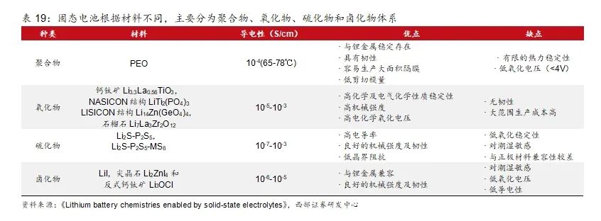电解质可分为聚合物固态和无机固态,主流四条固态电解质材料路线各有所长。根据固态电解质的材料不同,主要可以分为聚合物、氧化物、硫化物和卤化物体系。其中,聚合物电解质起步早,其具有良好的界面相容性和机械加工性,但常温离子电导率低(<10-6S/cm),限制其大规模应用;氧化物电解质目前发展进度较快,其稳定性好、电化学窗口宽、机械强度高,但界面相容性差、电导率一般且加工困难;硫化物电解质最理想的材料,其电导率高,接近液态电解液水平,但化学稳定性差、成本高加工难度大;卤化物电解质具备高柔韧性、易加工、氧化电位较高等优势,但与负极兼容性低,电导率需进一步提升。