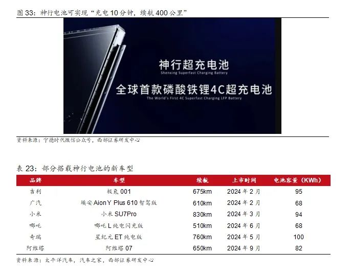 宁德神行电池快速放量,材料环节迎来升级。2023年宁德发布首款磷酸铁锂4C超充电池——神行电池,可实现“充电10分钟,续航400公里”,今年一季度迎来放量;今年4月,宁德发布神行PLUS电池,快充性能进一步提升,可实现“充电10分钟,续航600公里”,此后吉利、蜂巢也相继发布自研的铁锂超快充电池。近年来,磷酸铁锂电池占比迅速提升,续航及快充性能突破后性价比优势明显,下游订单需求明确,目前快充负极、高压实铁锂等环节产能紧张,高端产品溢价优势明显,相关企业有望受益。