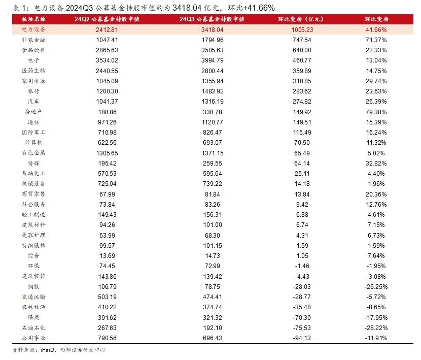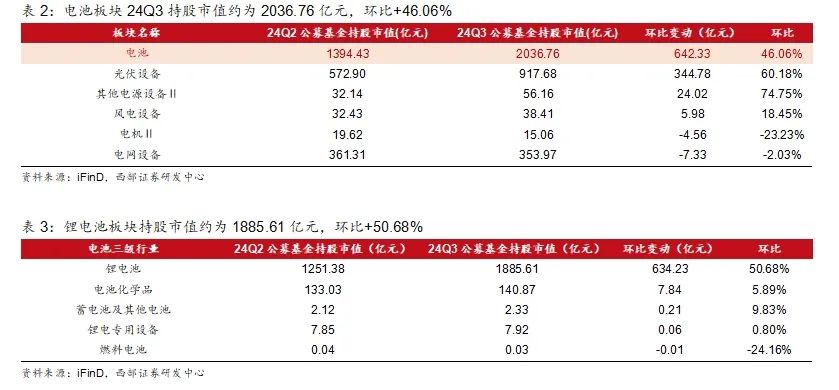 从公募基金持仓角度看,根据iFinD数据,按照申万一级行业分类,电力设备2024Q3公募基金持股市值约为3418.04亿元,环比+41.66%,变动金额位居板块榜首。其中,电池板块24Q3持股市值约为2036.76亿元,环比+46.06%,电池三级分类中,锂电池板块持股市值约为1885.61亿元,环比+50.68%,持股市值在锂电板块中占比最高。