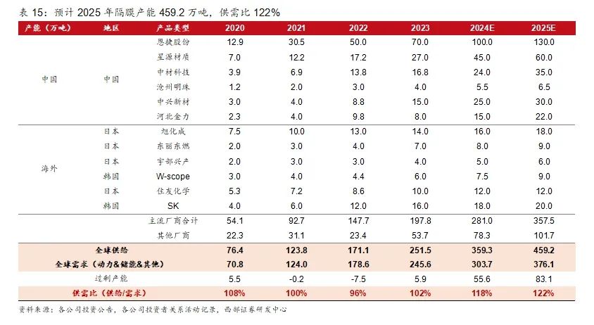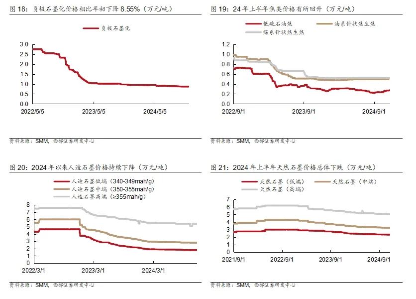 负极材料:价格有望触底回升,新产能扩张进度放缓。根据SMM数据,截至24年11月22日,低硫石油焦、油系针状焦生焦、煤系针状焦生焦价格分别为2745/4950/5225元/吨。其中煤系针状焦生焦价格相比年初下降0.48%,低硫石油焦、油系针状焦生焦价格相比年初分别回升7.02%/3.13%。负极石墨化价格8687.5元/吨,相比年初下降8.55%。中端天然石墨和中端人造石墨负极价格分别为3.24/2.82万元/吨,相比年初分别下降7.30%/7.99%。进入Q2后,头部厂商实现满产,快充类产品放量带动盈利改善,目前二线厂商仍处亏损状态,部分新增产能投产时间顺延,我们认为负极供给增速已小于需求增速,供需格局有望在25年逐步改善。