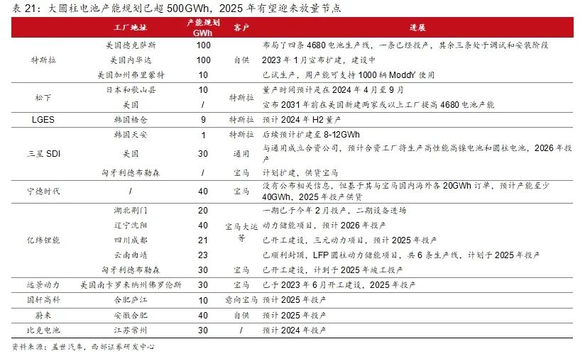 大圆柱电池产能规划已超500GWh,2025年有望迎来放量节点。自特斯拉2020年提出4680方案后,各家电池厂也宣布相继跟进。其中,宁德时代、亿纬锂能和远景动力已成为宝马大圆柱电池供应商;LG新能源今年8月开始试生产4680电池,年底有望实现量产;三星的46系电池将于2025年初具备量产能力。目前大圆柱动力电池的产能规划已超500GWh,2025年有望迎来大规模放量。