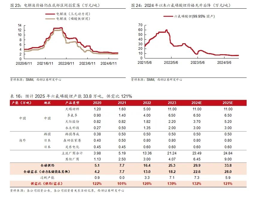 电解液与六氟:六氟价格回升,行业新增产能有限。根据SMM数据,截至24年11月22日,三元动力型电解液和磷酸铁锂型电解液价格分别为2.51/2.10万元/吨,相比9月2日价格低点回升2.97%/5.39%。六氟磷酸锂价格受上游原材料价格影响有所上涨,目前行业仅龙头厂商盈利,下游订单需求饱满,头部厂商基本满产,展望25年行业新增产能有限,供需格局有望改善;尾部厂商受限成本问题逐步退出,行业集中度有望进一步提升。
