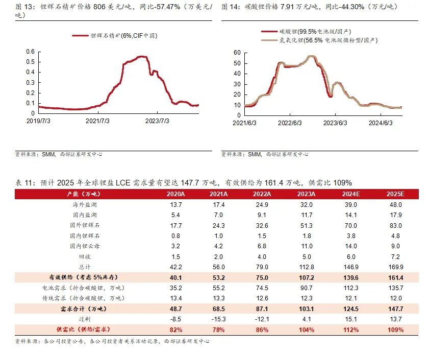11月澳矿减产供给端改善,锂盐价格有所回升。Q4以来,多家澳矿宣布减产或停产,10月,Pilbara宣布关停Nungaju采选厂,将FY25产量指引从82万吨下调至72万吨;11月,Mineral Resources宣布旗下项目Bald Hill的15万吨锂精矿产能关停;Liontown发布减产计划,将2027财年末的矿石产量目标从每年300万吨下调至280万吨。目前,下游排产处于高位、订单需求饱满,锂盐价格有所回升。根据SMM数据,截至2024年11月22日,锂盐主要原材料锂辉石精矿(6%,CIF中国)价格达806美元/吨,同比-57.47%,较9月9日低点回升8.92%;国内电池级碳酸锂价格7.91万元/吨,同比-44.30%,较9月9日低点回升9.48%。目前,供给侧增量释放有所减少,我们预计明年新增有效供给在20万吨左右,随着下游需求保持稳定增长,锂盐供需格局有望逐步改善,根据我们对全球锂盐供需统计和测算,25年全球锂盐LCE需求量有望达147.7万吨,有效供给为161.4万吨,供需比109%。