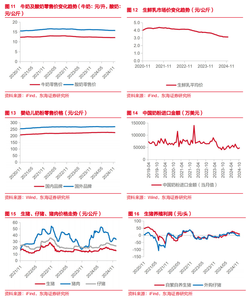 乳制品价格:截至12月06日,牛奶零售价12.15元/升,周环比-0.08%,同比-1.94%;酸奶零售价15.75元/公斤,周环比持平,同比-2.42%;生鲜乳3.12元/公斤,同比-15.20%;国内品牌婴幼儿奶粉零售价224.40元/公斤,国外品牌270.02元/公斤。另外,10月中国奶粉进口金额为47294.30万美元。