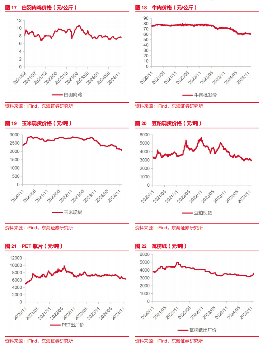 包材价格:截至12月13日,PET瓶片6300/吨,周环比+0.80%,同比-9.35%;瓦楞纸3590元/吨,周环比+3.61%,同比+3.46%。