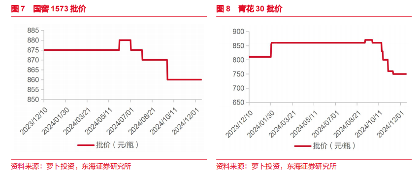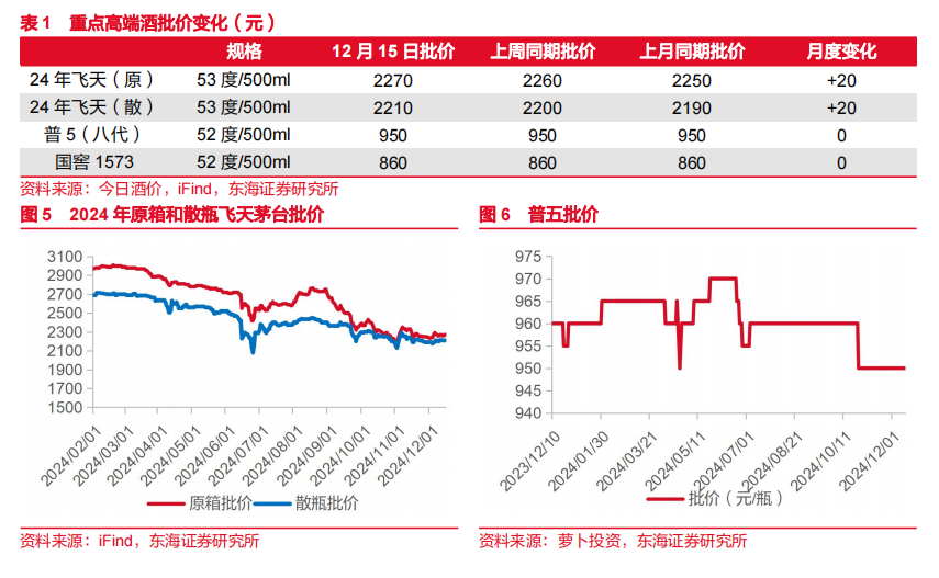 白酒:板块基本面筑底,关注酒企年末动销。今世缘:对于2025年的经营目标,不会咬定比对数字,但是省内精耕攀顶的目标没有动摇。2025年Q1可能环比有所改善,同比增长不会太快。明年产品战略,四开要继续稳中有升,发挥虹吸效应;会基于300-500元价格带优势努力向两端拓展,淡雅、V3 都、单开都将进一步放量,V6也将重点培育。预计明年主要酒企仍将积极去库,对业绩增速较为谨慎。批价更新:上周飞天茅台批价略涨。截至12月15日,2024年茅台散飞批价2210元,周环比上涨10元,月环比上涨20元;2024年茅台原箱批价2270元,周环比上涨10元、月环比上涨20元。五粮液普五批价为950元,周、月环比持平。国窖1573批价860元,批价周、月均环比持平。板块基本面已筑底,期待后续政策持续加码带动白酒需求修复。2025年春节时间较早,关注年底动销表现及酒企明年的业绩目标。白酒行业竞争加剧,头部酒企的市场份额不断提升且经营业绩稳健,建议关注高端酒和区域龙头。
