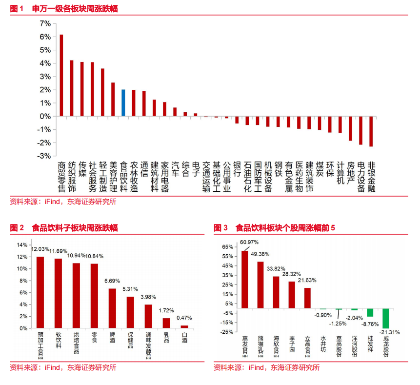 上周食品饮料板块上涨2.01%,跑赢沪深300指数3.02个百分点,食品饮料板块在31个申万一级板块中排名第7位。子板块方面,上周均上涨,其中预加工食品涨幅最大,达到12.03%。个股方面,上周涨幅前五为惠发食品、熊猫乳品、海欣食品、李子园、立高食品,分别为+60.97%、+49.38%、+33.82%、+28.32%、+21.63%。
