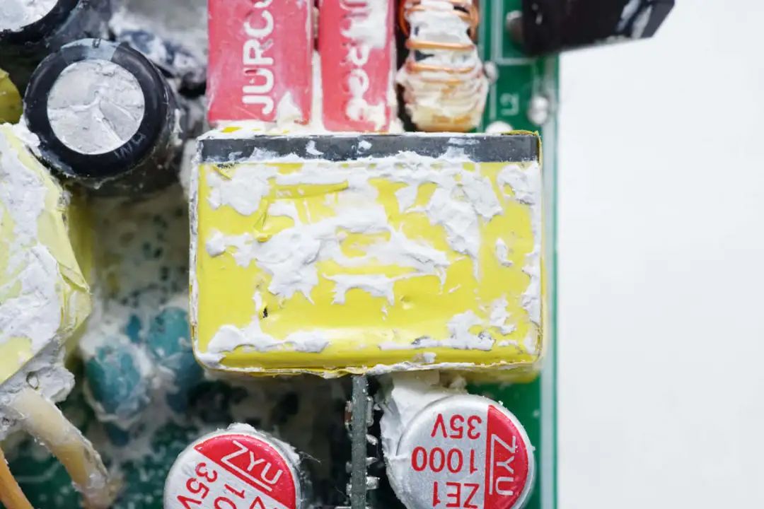LLC变压器特写,磁芯严密缠绕胶带绝缘。