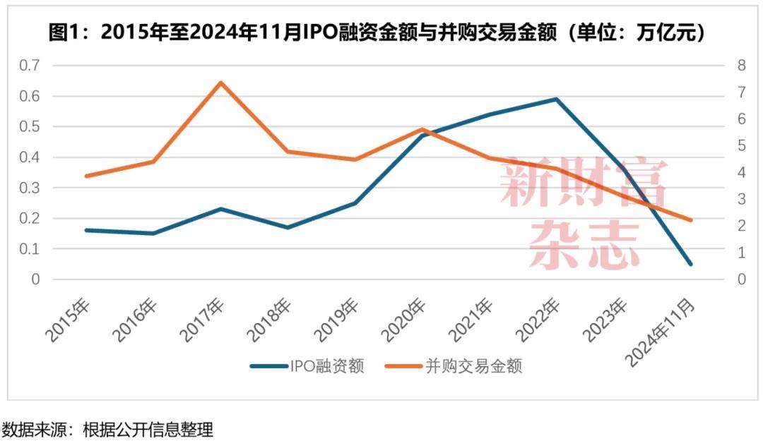 2022年至今,IPO融资金额和并购交易金额都呈现下滑趋势,且都在2024年下探至近10年最低点(图1)。