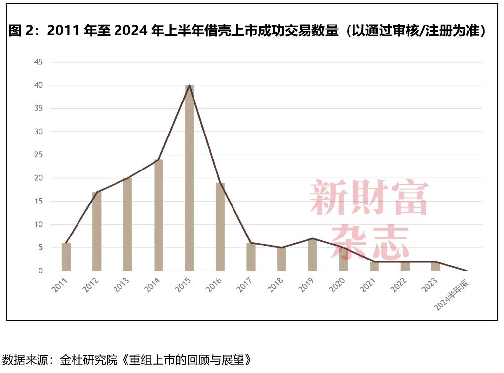 借壳上市方面,2024年上半年,市场披露的相关交易仅5起,其中2起已终止。全年借壳上市交易估计也处于较低水平(图2)。市场热议的奇瑞汽车等企业的借壳上市,还未见明确方案。