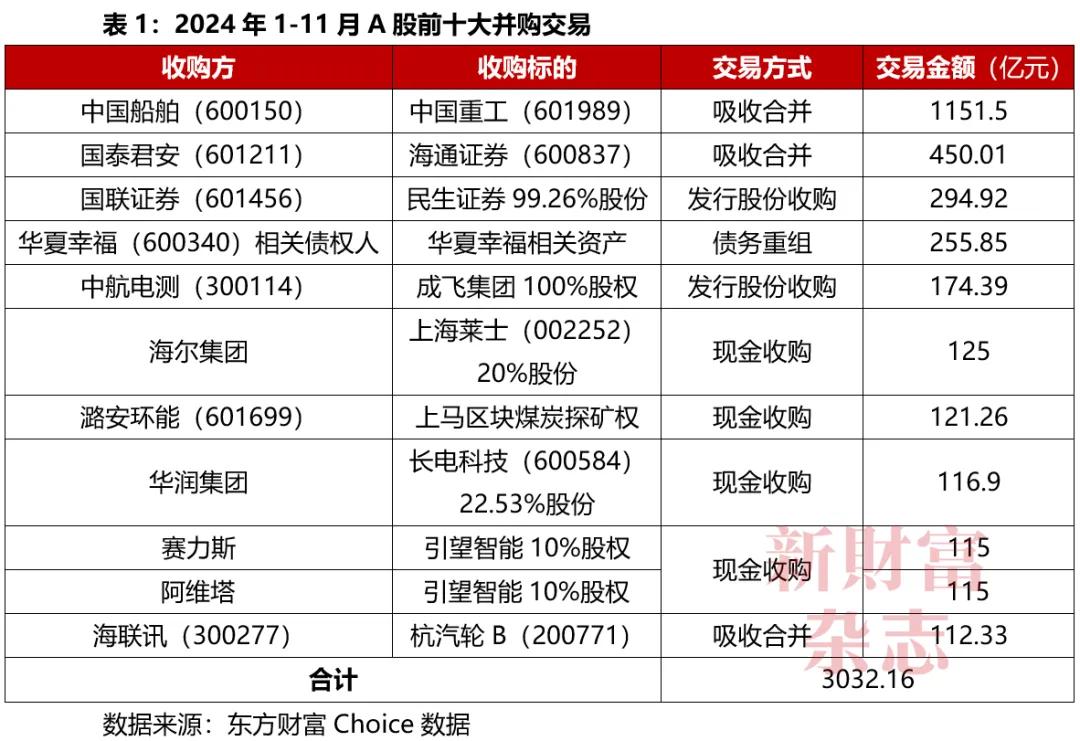 截至2024年11月,前十大并购交易(共11起交易,两起交易并列第9)中,国资、央企发起的交易有7起(不含海尔集团、华夏幸福、赛力斯和阿维塔的交易)。这7起交易金额合计2421.31亿元,占3032.16亿元总交易金额的79.85%(表1)。