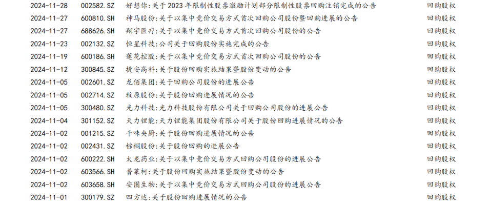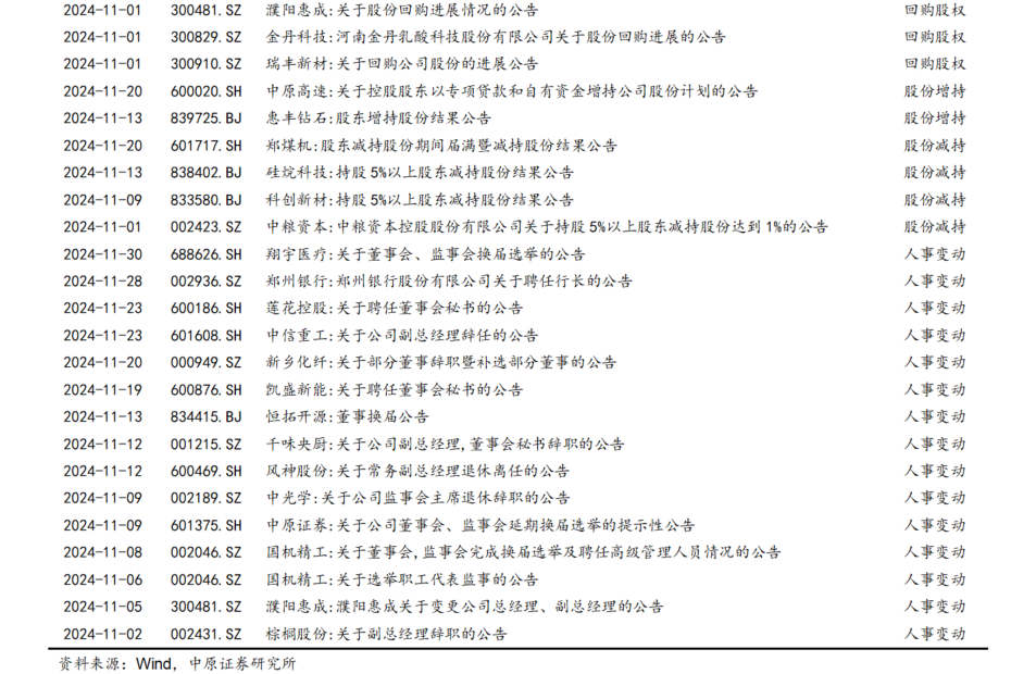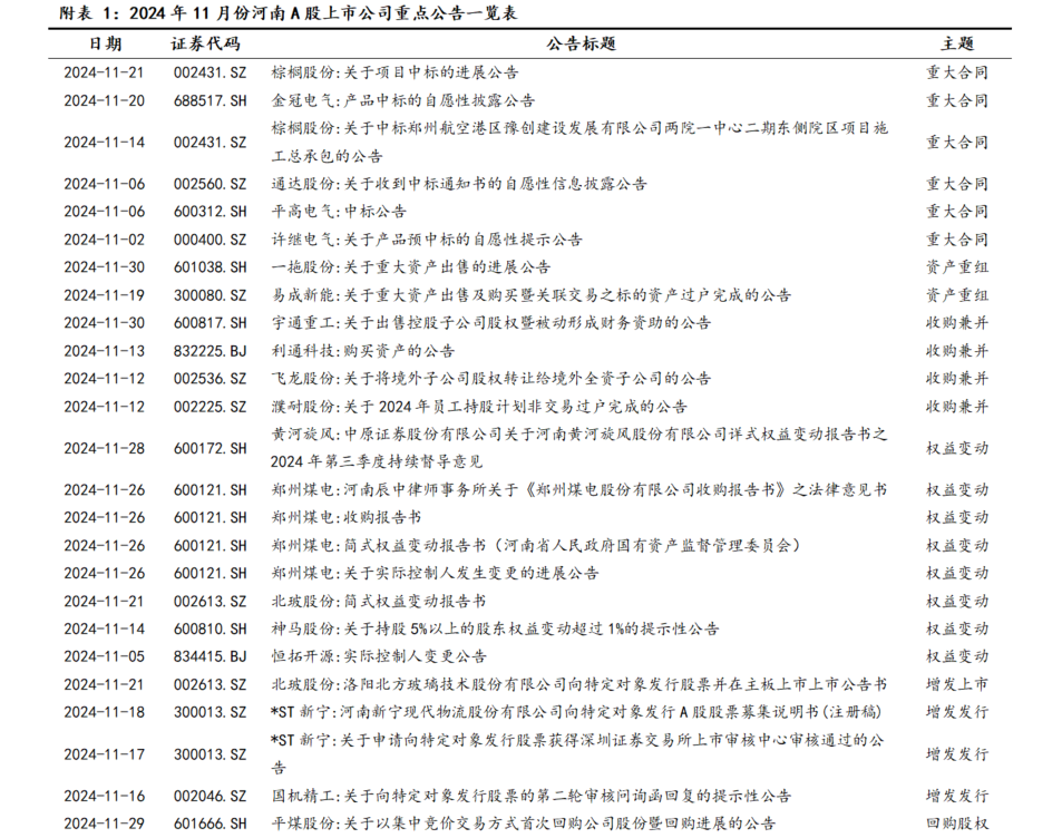 2024年11月份,河南上公司公告可重点关注重大合同、回购股权以及人事变动等事项。例如:棕榈股份(维权)、金冠电气、平高电气、许继电气等公司产品中标公告,神马股份、莲花控股以集中竞价交易方式首次回购公司股份,郑州银行聘任行长、国机精工、翔宇医疗董事会、监事会换届选举等人事变动公告。详见“附表1:2024年11月份河南A股上市公司重点公告一览表”。