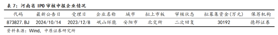 拟上市公司情况:11月份以来,河南省IPO审核通过尚待发行公司1家,为拟在深交所上市的中船双瑞。目前,河南省仅剩岷山环能1家申报在审企业,拟在北交所上市,拟融资规模为3.02亿元。