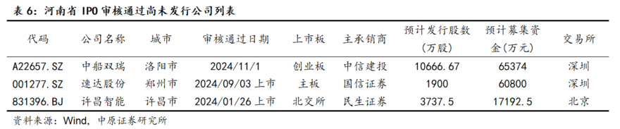 11月份以来,河南省IPO审核通过尚待发行公司1家,为拟在深交所上市的中船双瑞。本年度河南有2家上市公司IPO上市。
