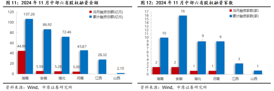 对比中部六省股权融资规模和数量,11月份,湖南有1家公司IPO和1家公司增发合计融资44.96亿元,安徽有1家公司IPO和1家公司增发合计融资5.59亿元,湖北、河南分别有1家公司IPO和增发融资,融资规模分别为5.28亿元、5.00亿元,其它两省当月均无股权融资。