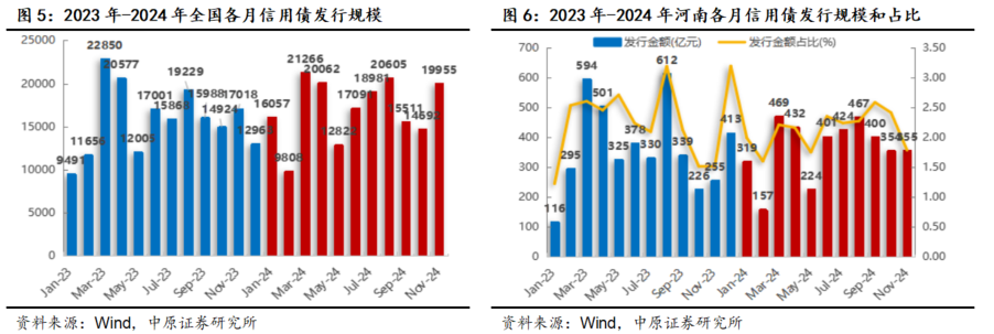 11月份,河南信用债券融资规模维持在355亿元的水平,发行规模全国占比持续回落。Wind数据显示,11月份,河南省发行信用债发行56只,融资规模355.49亿元,环比增长0.45%;前11个月,发行591只信用债,融资规模4011.02亿元,同比增长1.02%,排名保持全国第10位、中部六省第1位。