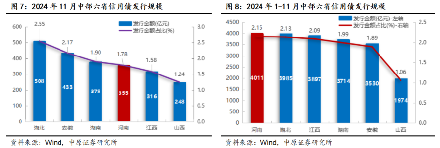 从中部六省情况看,11月份,湖北信用债发行规模508.41亿元位居六省第一,全国占比2.55%,安徽紧随其后,山西居六省末位。前11个月,河南省发债规模暂居中部六省第一位,湖北超越江西省居第二位,其他3省位次不变。