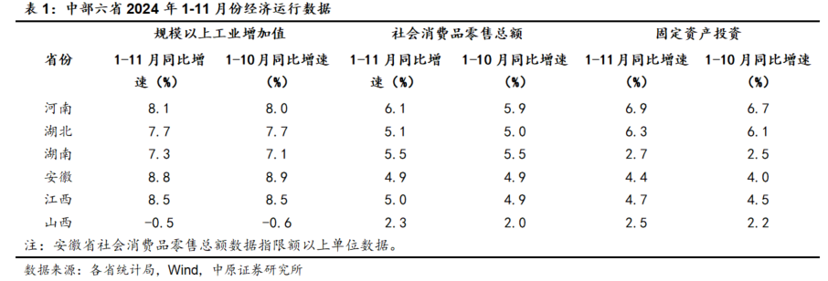 2024年1-11月份,中部各省主要经济指标稳中有进,经济运行总体呈现温和上升态势。具体表现为六省工业生产普遍维持高增速,社会消费平稳增长,固投力度普遍加大。相比较而言,河南省经济增势在中部六省中表现突出。