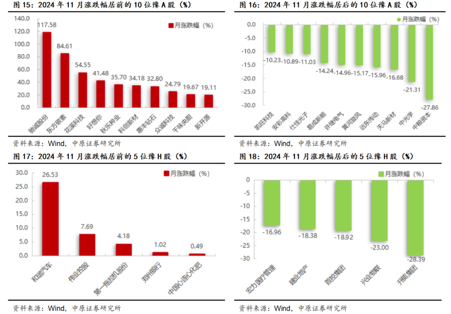 11月,豫H股涨幅前3位的公司有和谐汽车(26.53%)、伟业控股(7.69%)、第一拖拉机股份(4.18%)等,跌幅前3位的公司有升能集团(-28.39%)、兴业物联(-23.00%)、首控集团(-23.00%)等。