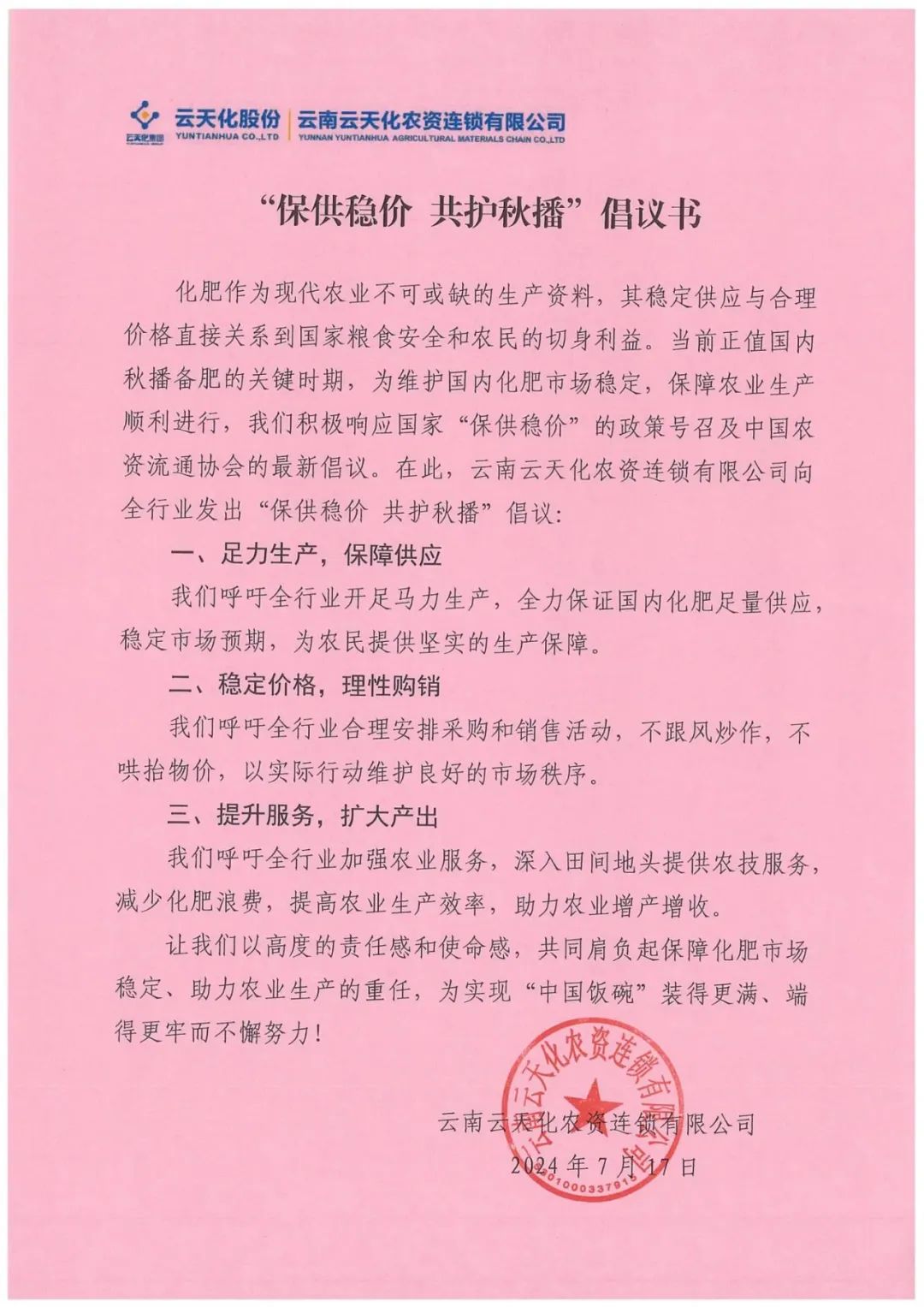 2024年7月17日,云天化发出了《“保供稳价,共护秋播”倡议书》,倡议广大合作伙伴共同携手,全力保证国内化肥足量供应和价格稳定,真正让利于农,践行保供稳价的社会责任。云天化倡议发出后,广大合作伙伴纷纷响应,第一时间表达支持。云天化将与广大合作伙伴一起努力,维护良好的市场秩序,做好农业服务体系建设,当好保障国家粮食安全的“压舱石”,为实现“中国饭碗”装得更满、端得更牢而不懈努力。