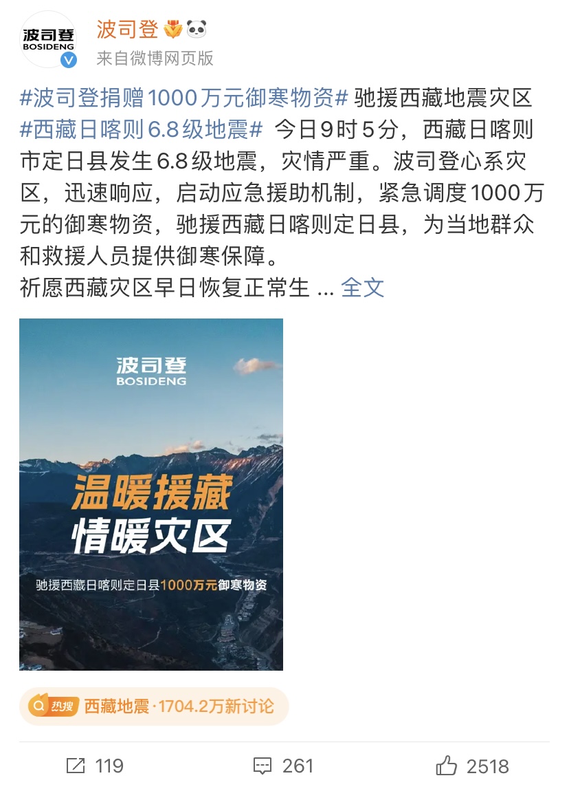 驰援西藏地震灾区的时尚行业品牌(持续更新)