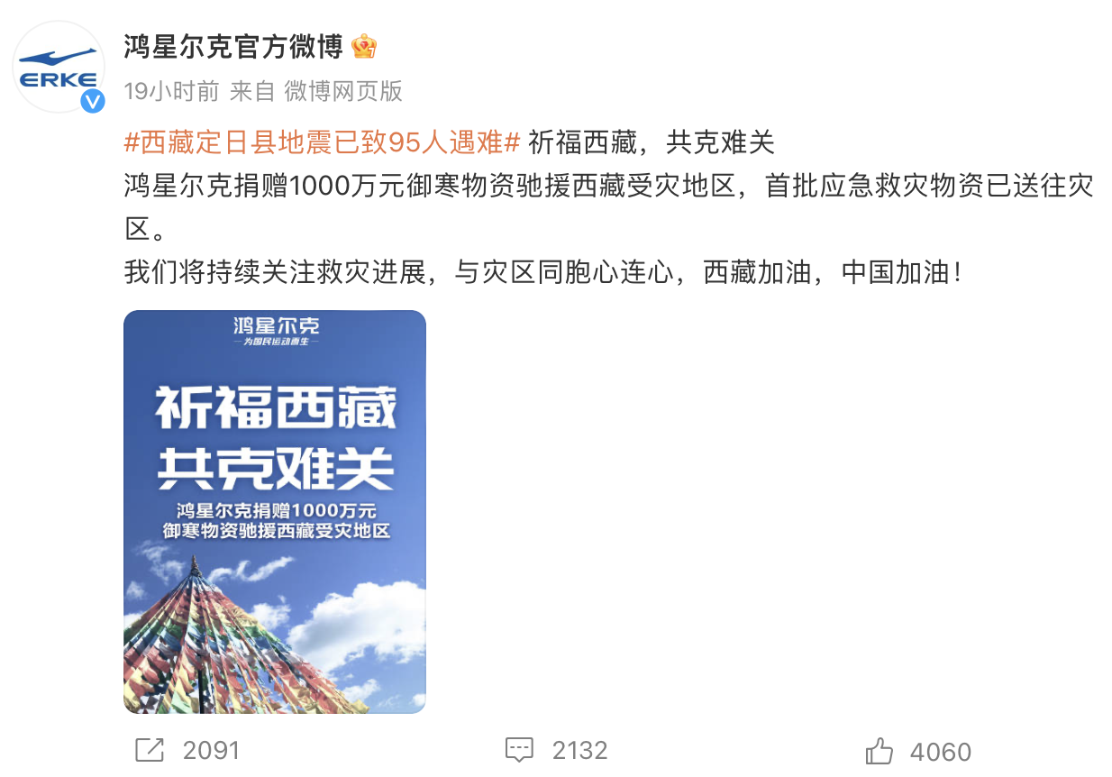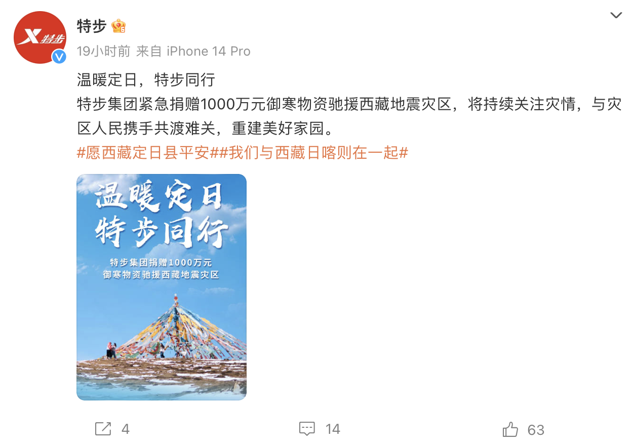 特步:紧急捐赠1000万元御寒物资驰援西藏地震灾区,将持续关注灾情,与灾区人民携手共渡难关,重建美好家园。