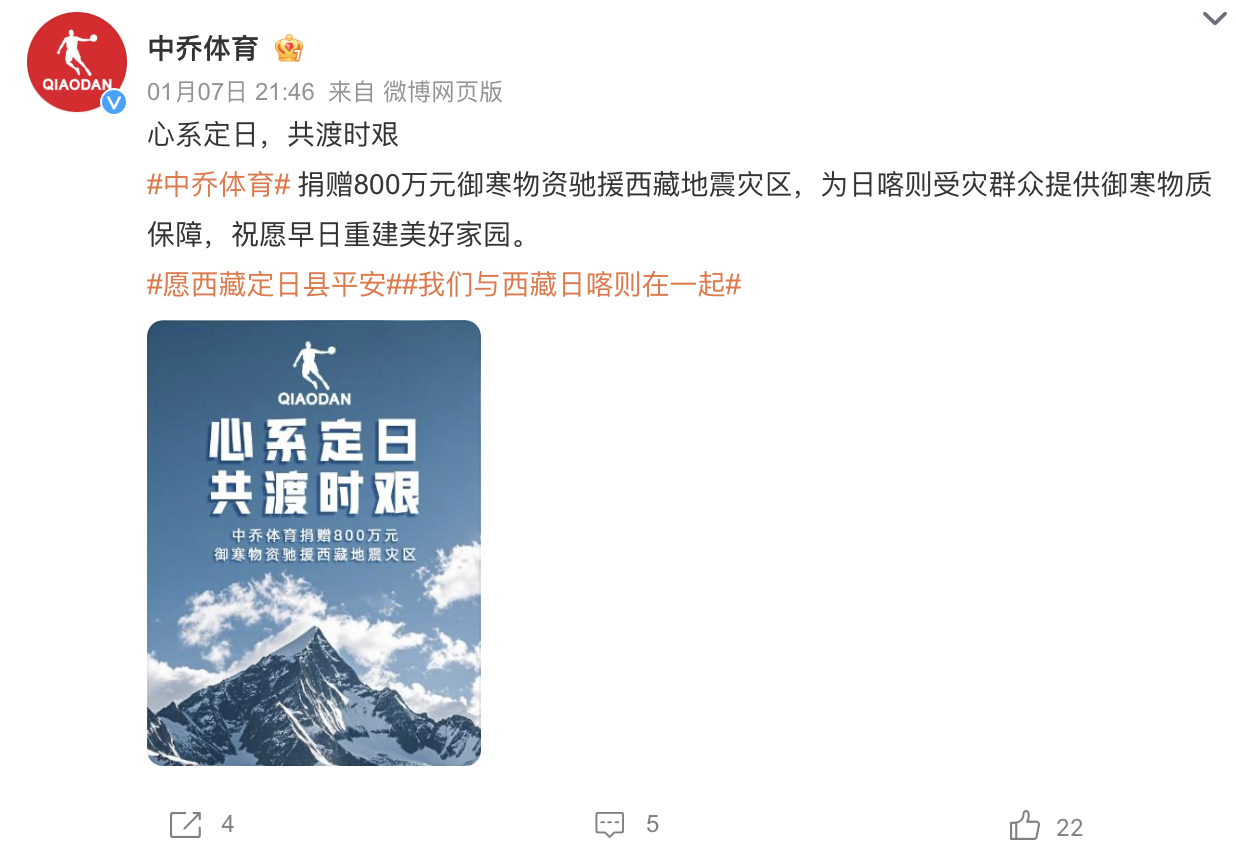 中乔体育:捐赠800万元御寒物资驰援西藏地震灾区,为日喀则受灾群众提供御寒物质保障,祝愿早日重建美好家园。
