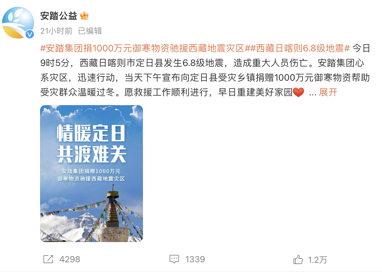 安踏公益:当天下午宣布向定日县受灾乡镇捐赠1000万元御寒物资帮助受灾群众温暖过冬。