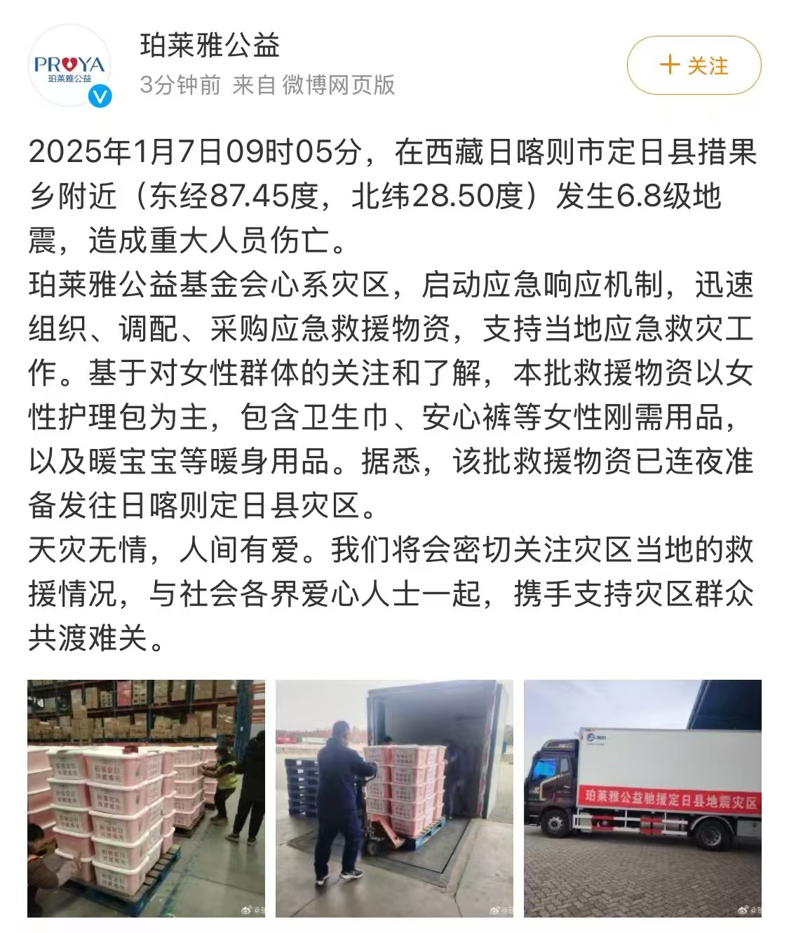 珀莱雅:基于对女性群体的关注和了解,本批救援物资以女性护理包为主,包含卫生巾、安心裤等女性刚需用品,以及暖宝宝等暖身用品。据悉,该批救援物资已连夜准备发往日喀则定日县灾区。
