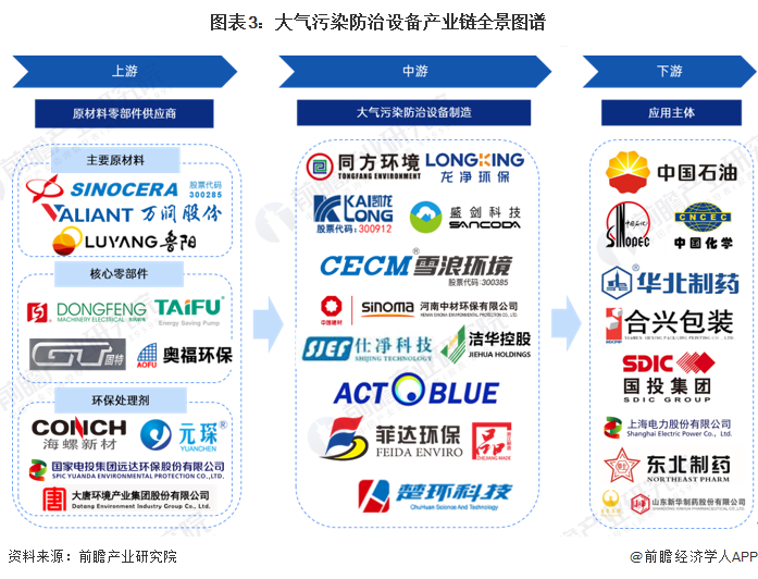 从产业链各环节代表企业来看,上游基础原材料代表企业有万润股份、鲁阳节能等,核心零组件代表企业有固特科技、东风机电、泰福泵业等,以及海螺新材、元琛科技、远达环保等环保处理剂供应商;产业链中游代表企业有龙净环保、菲达环保、凯龙高科、德创环保、盛剑科技、雪浪环境、仕净科技等;从产业链下游来看,应用主体包括中石油、中石化、华北制药、国投电力等工业及电力企业。