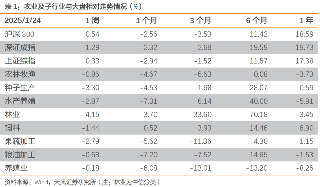 1)种子:①24年业绩预告:种子板块经营整体承压,其中,大北农24年归母净利润3.0~4.0亿元,同比扭亏,主要系生猪板块盈利提升;荃银高科/登海种业24年归母净利润分别为1.00~1.50/0.56~0.84亿元,同比降45.2%~63.5%/降67.0%~78.0%。②中共中央、国务院印发《乡村全面振兴规划(2024—2027年)》,提出“大力实施粮食单产提升工程”、“加快核心种源技术攻关”;农业农村部在新闻发布会提出,“粮食增产的重心在大面积单产提升上”,25年“更加突出‘大面积’…依托各类工程项目推进整建制单产提升”。③我们认为,转基因增产效果显著,国内自研的转基因抗虫耐除草剂玉米可减损增产约9%;随着国家粮食安全重要性突显,转基因玉米商业化种植有望加速,头部种企凭借领先的转基因技术等储备有望进一步提升竞争力。