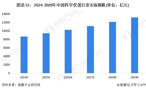 未来我国科学仪器市场需求将来自于企业研发部门、高校科研院、国立科研机构;企业研发部门数量的扩张、高校科研院所队伍的扩大以及国立研发机构建设的加快将带来科学仪器应用需求的增长。同时,我国科学仪器产品质量和技术水平的提升将有力推动科学仪器行业国产化替代,未来我国科学仪器行业的国产替代空间巨大;初步预测,2029年,我国科学仪器市场规模将突破1.3万亿元。