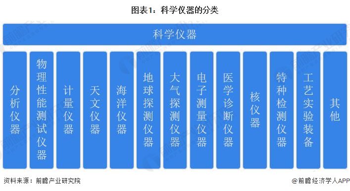 根据《大型科学仪器设备分类标准和共享数据库信息规范》将科学仪器设备按大的应用领域分为十三大类,主要包括分析仪器、物理性能测试仪器、计量仪器、天文仪器、海洋仪器、地球探测仪器、大气探测仪器、电子测量仪器、医学诊断仪器、核仪器、特种检测仪器、工艺实验装备和其他仪器。在前十一大类中,前三类:“分析仪器”、“物理性能测试仪器”和“计量仪器”属通用型“科学仪器”,后八类则属专用型“科学仪器”。前十一大类下又细分众多小类,具体的科学仪器分类情况如下: