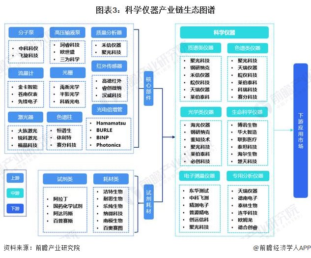 科学仪器行业产业链纵深较长,上游核心部件企业主要包括中科科仪、飞旋科技等分子泵企业,大族激光等激光器企业,恒谱生、依利特等色谱柱企业,禹衡光学等光栅企业,高德红外等红外传感器企业,金卡智能、先锋电子等流量计企业,珂睿科技等液流高压泵企业,以及禾信仪器、聚光科技等质量分析器企业,试剂耗材企业主要包括阿拉丁、国药化学试剂、耐思生物、乐纯生物等;中游科学仪器制造企业主要包括聚光科技、钢研纳克、禾信仪器、皖仪科技、天瑞仪器、赛分科技、华大智造、普源精电、欧姆龙等;科学仪器行业下游主要为各大科研主体,学校实验室等,代表单位有清华大学,西北工业大学等。