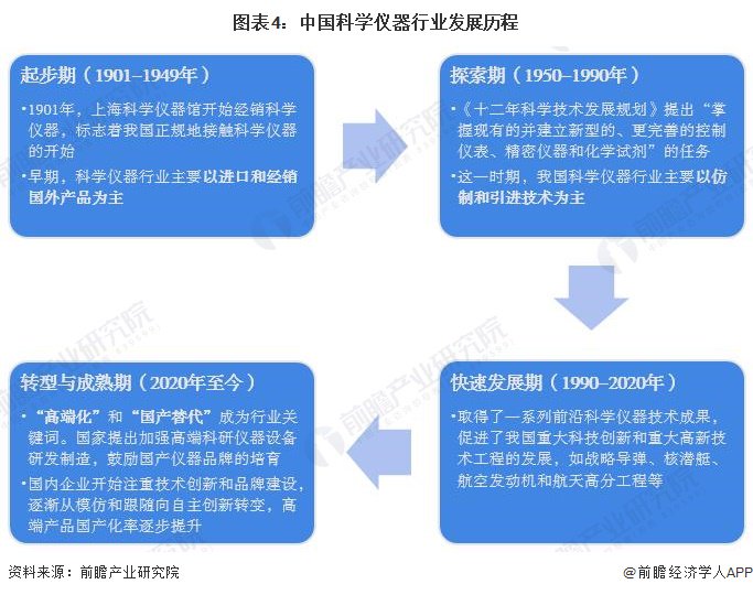 与国外19世纪就开始科学仪器设备研究和生产相比,我国的科学仪器研发还有着很大的差距,而起步晚、底子薄是主要原因之一。我国错过了第一次工业革命和第二次工业革命,几乎没有现代意义上的相关科技的积累作为基础。中国科学仪器行业在经历了起步期、探索期后,于1990年进入了快速发展期,并在2020年初开始进入转型与成熟期。在这一新阶段,行业更加注重技术创新和品牌建设,努力实现“高端化”和“国产替代”,以满足国内外市场的日益增长的需求。