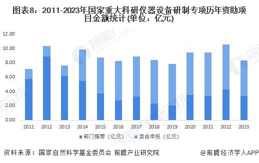 为支持我国科学事业的发展,推动我国科技发展进程,国家自2001年起成立国家自然科学基金委员会,重大科研仪器研制项目是基金资助的项目之一,包括部门推荐和自由申请两个亚类,研究期限5年。其中,部门推荐的直接费用预算在1000万元/项以上(含1000万元/项),自由申请的直接费用预算不超过1000万元/项。根据国家自然科学基金委员会披露的统计数据,2023年全国共有67个项目获得国家重大科研仪器研制项目(4个部门推荐,63个自由申请)。