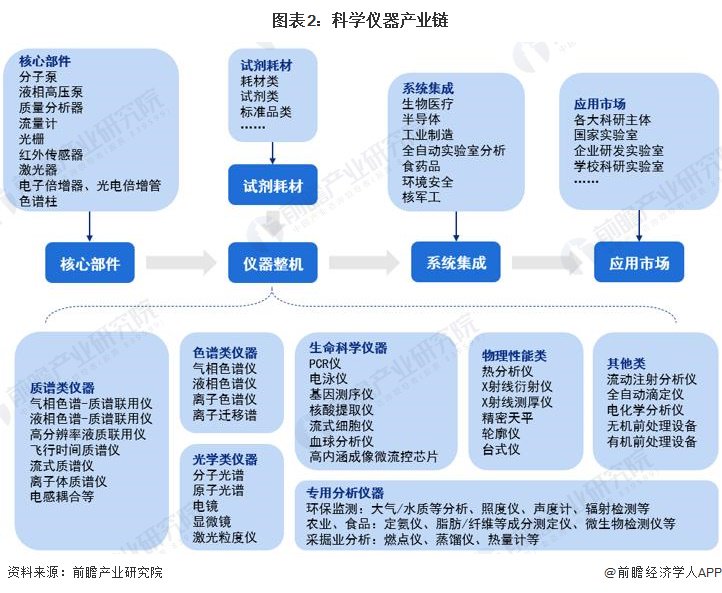 科学仪器行业产业链上游为科学仪器生产制造原材料和零部件供应行业;中游为科学仪器研发制造生产行业;下游为科学仪器需求市场,主要需求者包括各大科研主体、国家实验室、企业研发实验室、学校科研实验室等。