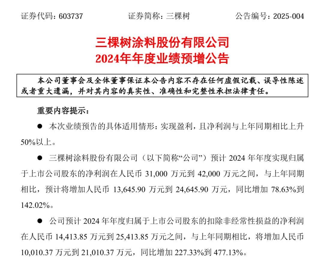 1月22日,三棵树发布2024年年度业绩预增公告。公告显示,三棵树预计2024年年度实现归属于上市公司股东的净利润在3.1亿元到4.2亿元之间,与上年同期相比,预计将增加1.36亿元到2.46亿元,同比增加78.63%到142.02%。业绩预增的主要原因包括:积极应对市场变化,优化收入结构,推出新产品及改进现有产品;重视成本管理及费用管控,有效降低成本费用支出;报告期内收到政府补助增加,影响非经常性损益;根据谨慎性原则计提相关资产减值和信用减值准备,预计较上年同期下降。