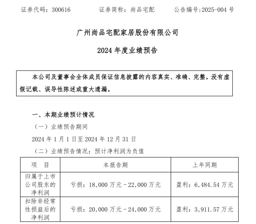1月21日,尚品宅配公布2024年度业绩预告,2024年归属于上市公司股东的净利润亏损1.8亿元–2.2亿元,上年同期盈利6,484.54万元;扣除非经常性损益后的净利润亏损2亿元–2.4亿元,上年同期盈利3,911.57万元。