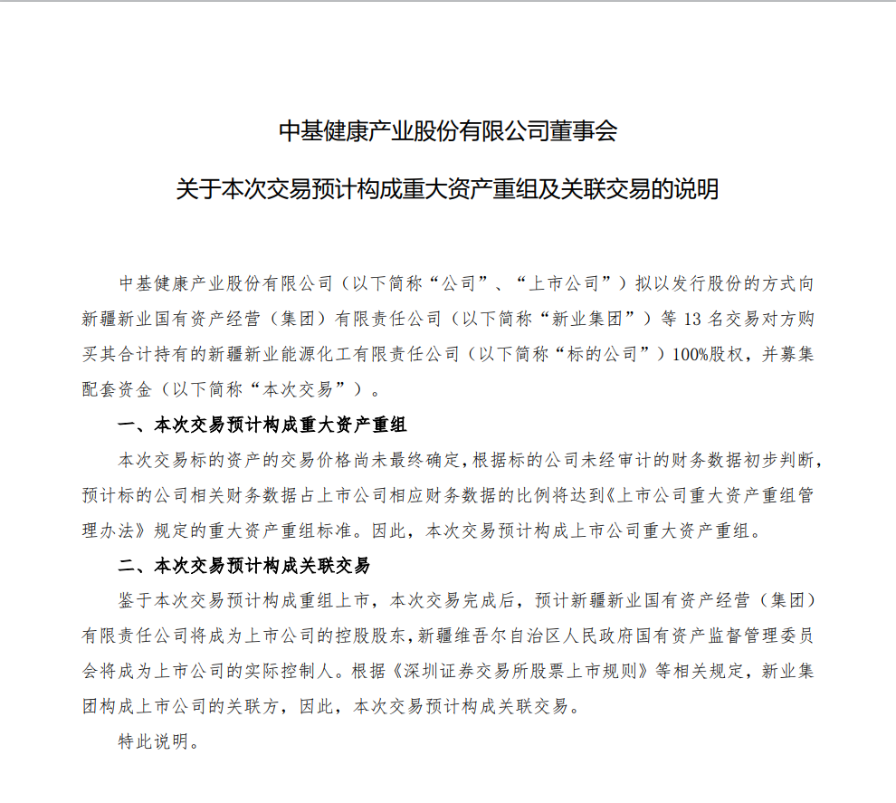中基健康(SZ000972)2月4日晚间披露,公司拟向新业集团、新业盛融等发行股份购买其持有的新业能化100%股权,并向特定投资者发行股份募集配套资金。公司股票将于2025年2月5日开市起复牌。公告称,本次交易预计构成重组上市,交易完成后,预计新业集团将成为中基健康的控股股东。