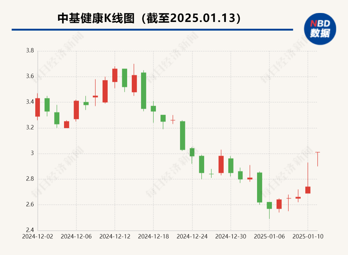 值得一提的是,停牌前一交易日,即1月13日,中基健康以涨停板开盘,收报3.01元/股,涨幅9.85%,全天成交额9841万元,总市值为23.22亿元。