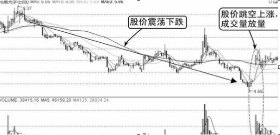 由图中可知,该股前期从8.37元高点处一路下跌,成交量萎缩至地量水平,说明市场各方一致看空。几个月后,股价有所起色,出现了小幅上涨,可惜好景不长,股价很快就再次下跌。没过多久,股价跳空上涨,成交量放出大量,如下图所示。