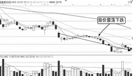 由图中可知,股价在前期25.36元处见顶,随之股价表现得极度弱势,连续收出阴线并呈斜坡式的下跌,随后股价在低位进行横盘数日。横盘结束后,股价出现跳空阴跌,同时成交量放大,后市走势如下图所示。