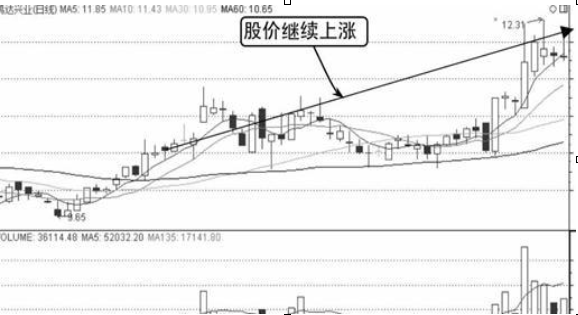 由图中可知,股价从高位震荡下跌,成交量此时并未放大,而是保持地量水平,说明股价下跌没有多少接盘,市场普遍不看多。股价两次成功探底后开始展开拉升的行情,到达一定高度后出现跳空上涨,成交量放大,如下图所示。
